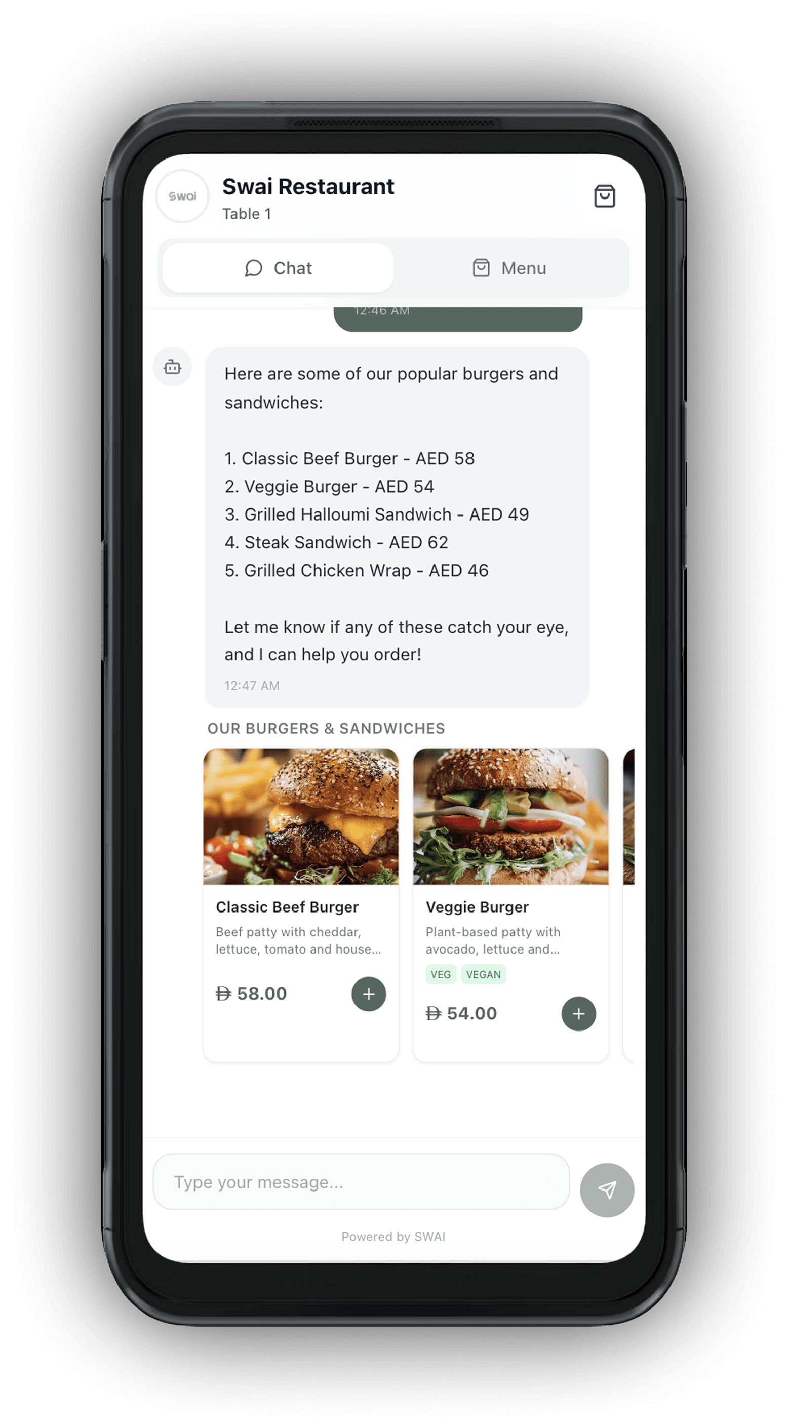 Swai doesn't replace your servers; it unburdens them. By automating the routine tasks of taking orders and processing payments, your staff is free to provide the high-touch hospitality that brings guests back.